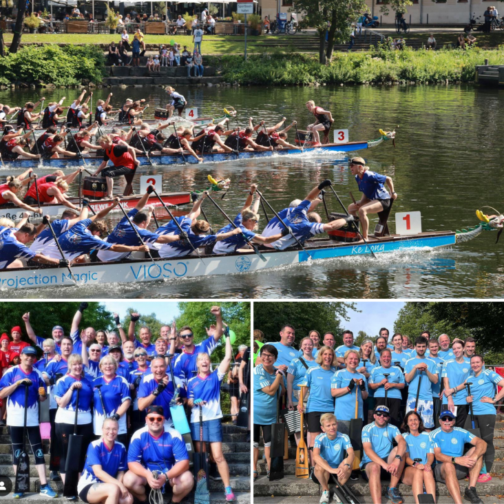 Das Drachenboot Festival ist bei den Teams so beliebt, weil die Rennstrecke mitten in unserer wunderschönen Stadt liegt und die Atmosphäre an den Regattatagen immer etwas Besonderes ist. Aus diesem Grund freuen sich die KHTC Teams Flying Blue und Broicher Seeadler immer schon von Saison Beginn an auf das Mülheimer Drachenboot Festival. Daher war eine Teilnahme dieser beiden Teams von Anfang an gesetzt. Hinzu kamen verschiedene Bootsbesatzungen, die von den KHTC Drachenboot Trainern auf diese Regatta intensiv vorbereitet und trainiert wurden. Da waren zum einen die Schauenburg Dragons, der Firma Schauenburg Ruhrkunststoff GmbH, ein Team, welches im 12er Boot startete und das ganze Jahr bei uns trainierte. Zum anderen waren da die Drachenboote vom Gymnasium Broich, die sich bereits seit Jahren mit unserer Unterstützung auf die Heimregatta vorbereiten. Organisiert durch unsere Flying Blue Paddlerin und Lehrerin am Gymi Broich Eltje und ihrem Kollegen Seydi bereiteten sich die Teams Spartiaten, Ältestenrat Broich, Legenden Broich sowie die Korrekturensöhne/innen*divers Broich unterstützt durch die Trainer Kenny, Alex, Uwe und Oliver bei uns auf das Festival intensiv vor. Zu guter Letzt wurde die Karnevals Gesellschaft Blau Weiß, wie jedes Jahr von Kenny rennfertig trainiert.