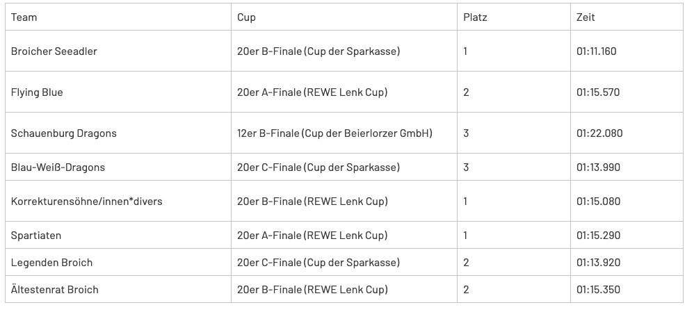 Während des Regattatages Samstag, den 07.09.24 wurden auch diese Teams in einem ganz großen Maß von den KHTC Trainern und Steuerleuten durch die einzelnen Rennen gesteuert. Alle Teams konnten mit sehr guten Ergebnissen aufwarten. Die Flying Blue erreichten das A-Finale des REWE Lenk Cups nach 2 gewonnen Vorläufen. In einem sehr starken und spannenden Rennen setzte sich das Gymnasium Broich mit dem Team Spartiaten Broich an die Spitze des Feldes und siegte. Die Flying Blue mussten sich knapp geschlagen geben und wurden stolzer 2 mit einer Zeit von 01:15.570. Am Ende stand der 17. Platz in der Gesamtwertung. Nach einem fulminanten Start im 1. Vorlauf setzte sich unser Team Broicher Seeadler gegen starke Gegner wie Master Of Desaster und Ruhrfire durch und paddelte mit einer weiteren sehr guten Platzierung im 2. Vorlauf ins B-Finale des Cups der Sparkasse Mülheim an der Ruhr. Dieserde von den Seeadlern in einem sehr starken Feld mit herausfordernden Gegnern in einer Zeit von 01:11.160 gewonnen. Somit wurde das Team 6. In der Gesamtwertung von 70 teilnehmenden Teams. Zum guten Schluss paddelte das Team noch im 2.000 Meter Verfolgungsrennen und erreichte das Ziel als 7.