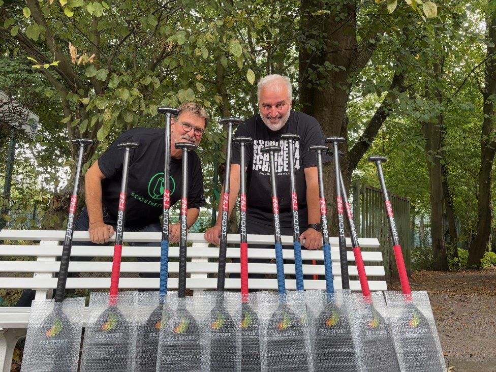 Kurz vor „Tore Schluss“ kamen die bestellten Carbonpaddel zu unserer Heimregatta, dem „29. Mülheimer Drachenboot Festival“, für unsere Paddlerinnen und Paddler doch noch an. Ein Carbonpaddel wiegt unter 300 Gramm und ist damit um ein vielfaches leichter als die üblichen Aluminium Paddel. Aus diesen Gründen und aufgrund eines großen Preisunterschiedes bestellen wir die Paddel direkt beim Hersteller. Die einzige Herausforderung: die Paddel kamen alle in einer Maximallänge (130 cm) und die Griffe wurden separat geliefert.