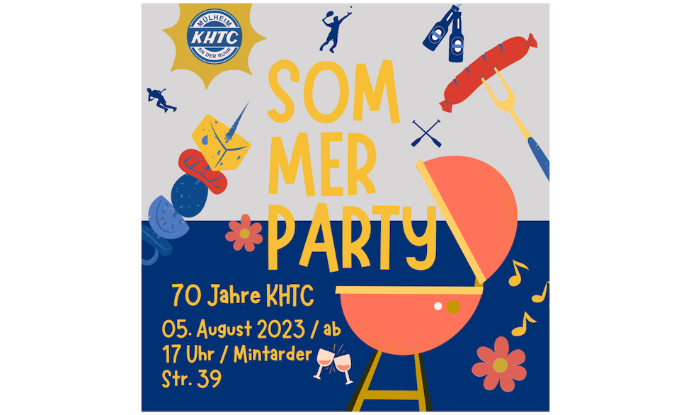 Unter dem Motto "70 Jahre KHTC" laden wir euch alle herzlich ein zu unserer diesjährigen Sommerparty. Am 5. August 2023 wird ab 17 Uhr gemeinsam gefeiert! Für die Kleineren sind Hüpfburgen aufgebaut, für alle gibt es reichlich Popcorn, Cocktails, weitere Speisen und Getränke – und der "Opa Kahlenberg" spendiert allen Kindern bis 14 Jahren ein Eis, gesponsert von der Firma Parkett und Bodenbeläge Surau. Ab 19 Uhr ist dann mit der Oberhausener Coverrockband "Zündholz" Party angesagt.